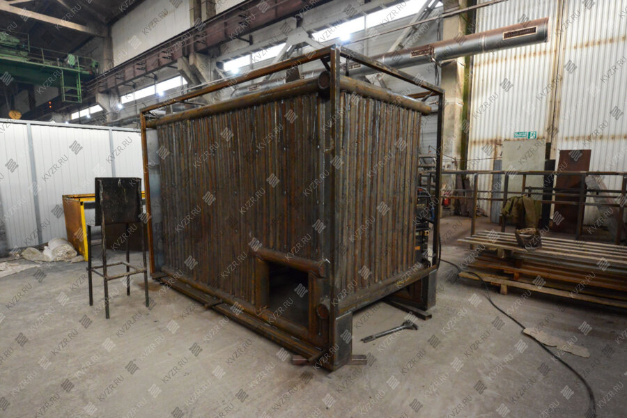 Блок водонагревательного котла КВм 0,58 МВт представляет собой горизонтальную стальную сварную конструкцию, состоящую из трубной системы (радиационной и конвективной поверхности нагрева), опорной рамы и каркаса с теплоизоляционными материалами, обшитого листовой сталью. Топочная камера состоит из труб Ø 57x3,5 мм. Конвективная поверхность нагрева состоит из пакетов выполненных из труб Ø 32x3 мм, для интенсификации теплообмена трубы пакетов расположены в шахматном порядке.
