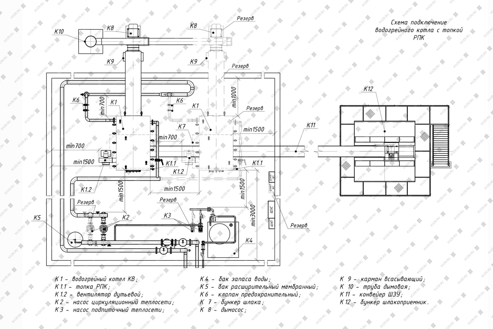 Чтобы правильно подключить котел КВм-1,16 с топкой РПК в котельной необходимо оставить проемы для обслуживания оборудования во время эксплуатации. На представленной здесь схеме указаны их минимальные размеры. Кроме того, в данной примерной схеме монтажа водогрейных котлов и оборудования указан перечень минимально необходимого вспомогательного оборудования для правильной работы котла.