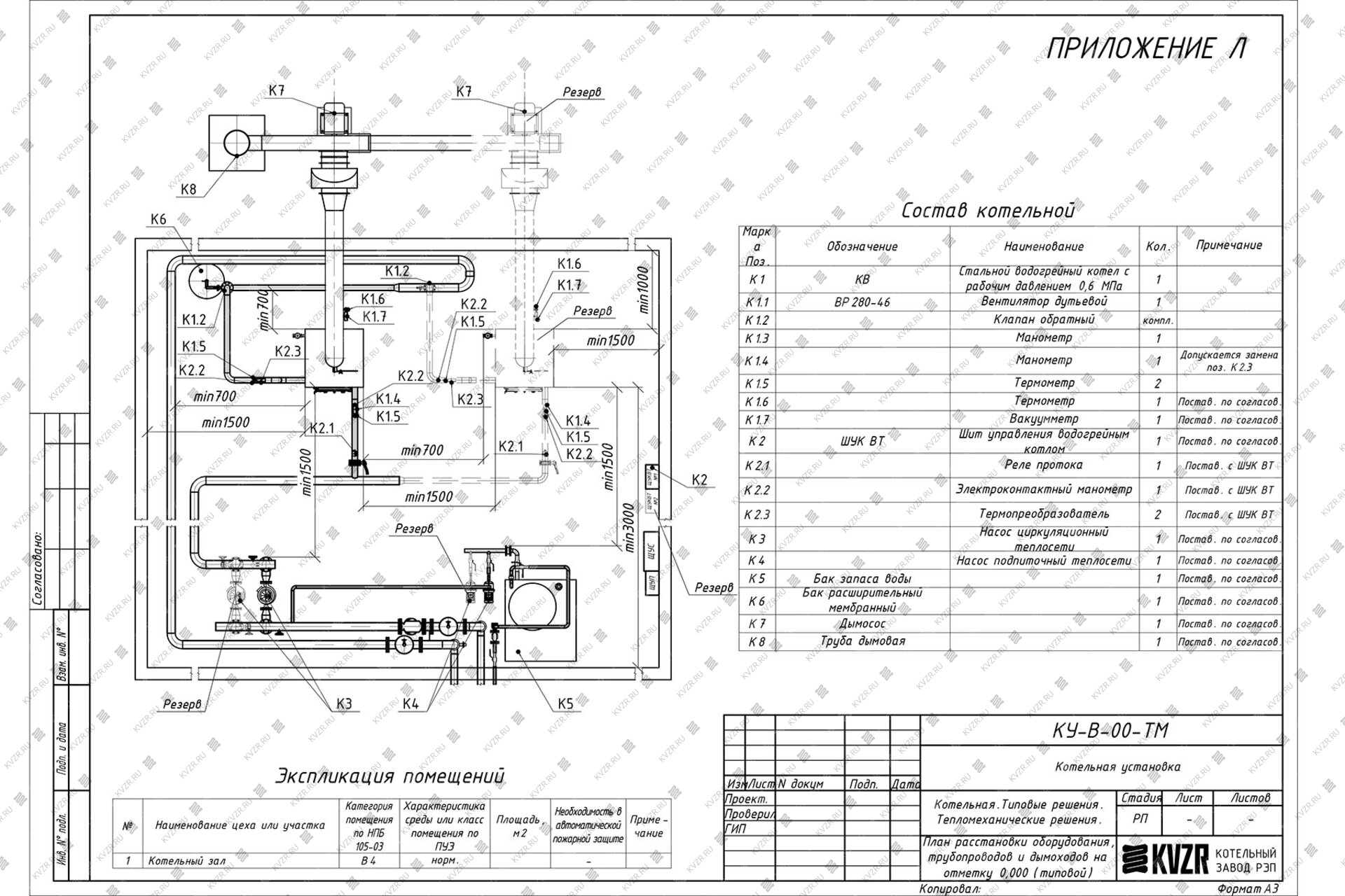 Чтобы правильно подключить котел КВр-0.15 в котельной необходимо оставить проемы для обслуживания оборудования во время эксплуатации. На представленной здесь схеме указаны их минимальные размеры. Кроме того, в данной примерной схеме монтажа водогрейных котлов и оборудования указан перечень минимально необходимого вспомогательного оборудования для правильной работы котла.