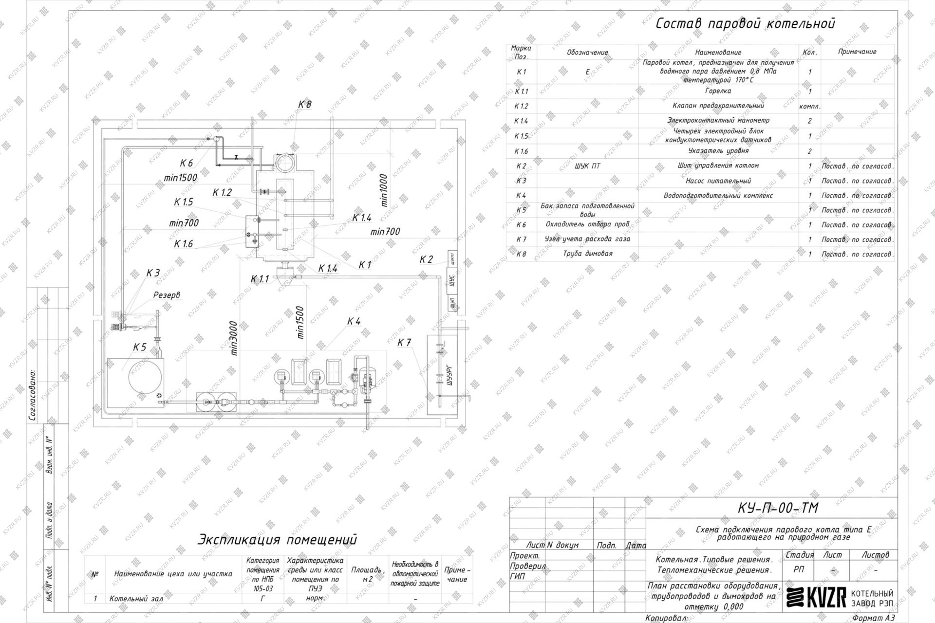 Чтобы правильно подключить газовый паровой котел 2500 кг / 2.5 т пара -170°С -0,9 МПа / 9 кгс/cм² в котельной необходимо оставить проемы для обслуживания оборудования во время эксплуатации. На представленной здесь схеме обозначены их размеры. Кроме того, в данной примерной схеме монтажа паровых котлов и оборудования указан перечень минимально необходимого вспомогательного оборудования.