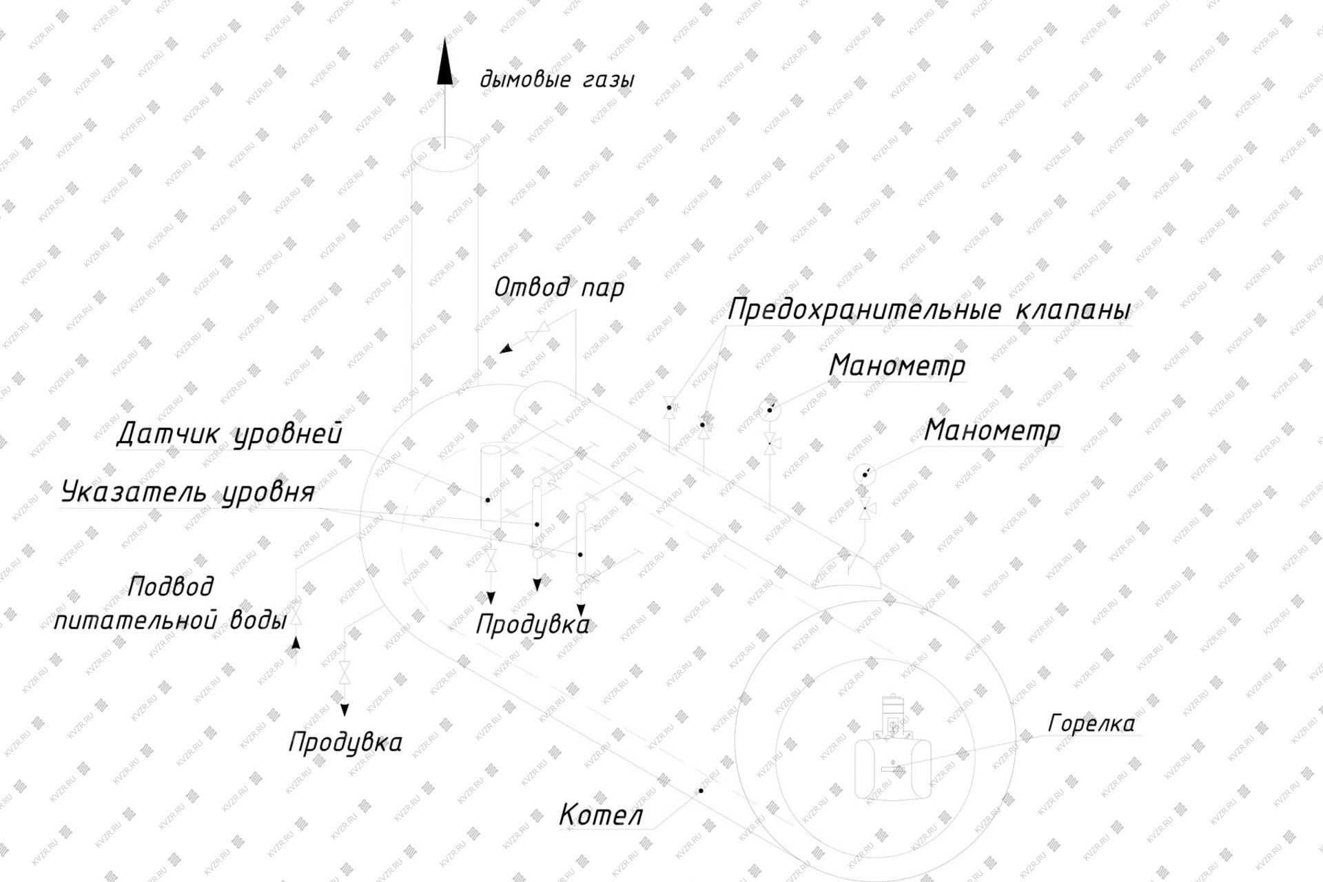 На котле имеются продувочные штуцера Ду25, Ду15 и Ду10. Штуцер Ду25 предназначен для удаления шлама, образующегося в результате работы котла, периодической продувки котловой воды и для спуска воды в случае необходимости. Штуцер Ду15 предназначен для продувки водомерной колонки. Штуцера Ду10 предназначены для продувки указателей уровня.