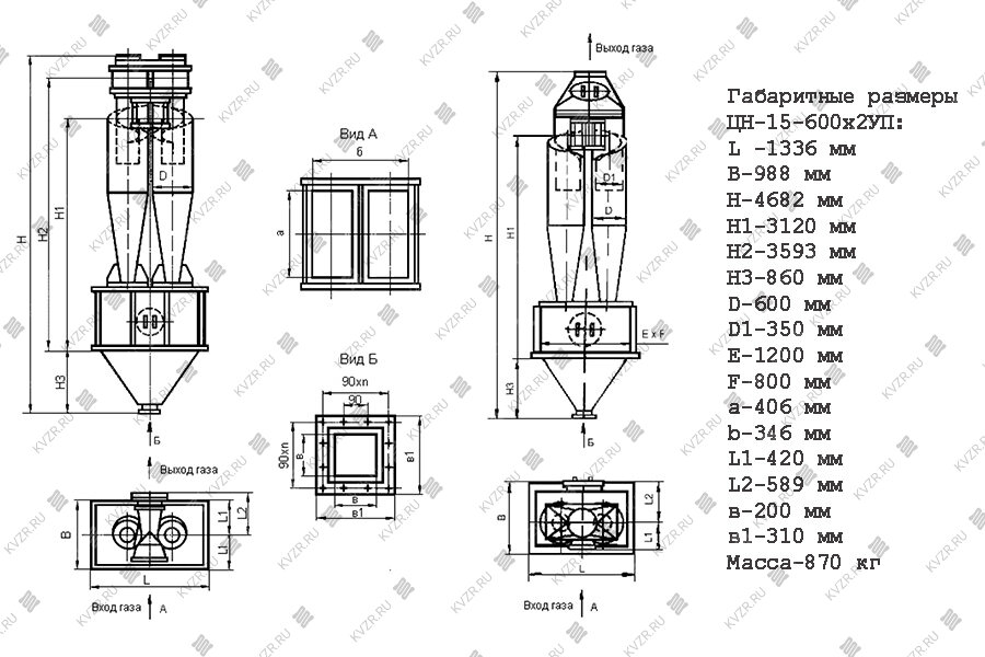 Бункеры имеют пирамидальные форму. Аппарат группового исполнения изготовляют с "левым" и "правым" вращением газового потока, одиночные - только с "правым" вращением.